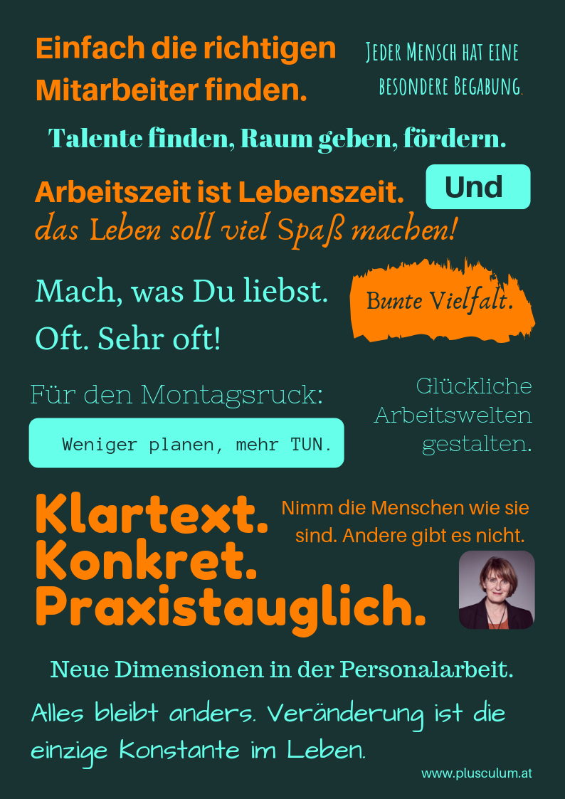 Hinter dem „Warum“ stehe ich, Silke Glüsenkamp als Macherin von plusculum. Einige Menschen halten mich für eine Träumerin und unverbesserliche Idealistin. Mein Ziel ist es, eine rundum glückliche Arbeitswelt zu schaffen. Menschen ticken alle unterschiedlich und ist es nicht eine fantastische Idee, dass jeder Montagmorgens fröhlich aus dem Bett springt und abends heiter nach Hause fährt, weil er seine Arbeit liebt? Für mich ist es immer ein Gänsehautmoment, wenn ich sehe, dass Menschen ihre Arbeit lieben und sie dort all ihre Stärken einsetzen dürfen.